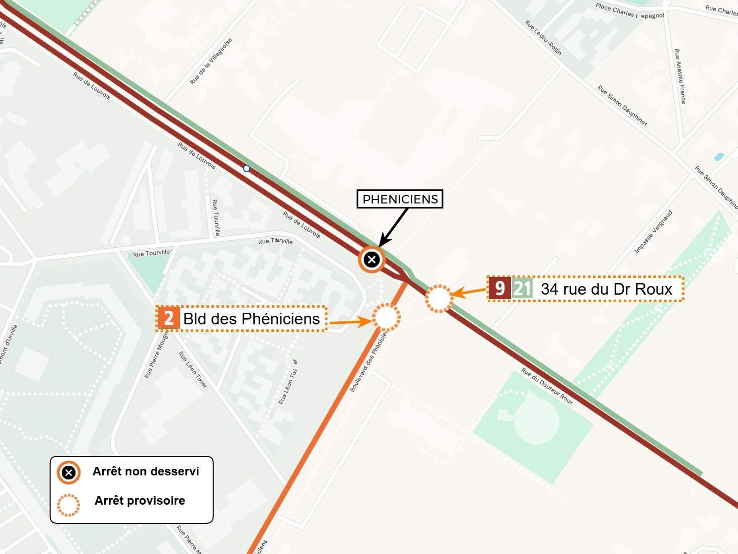 L'arrêt PHENICIENS dans le sens TINQUEUX BOUTREAUX est déplacé 150 mètres après l'arrêt, face au 146 rue de Louvois |