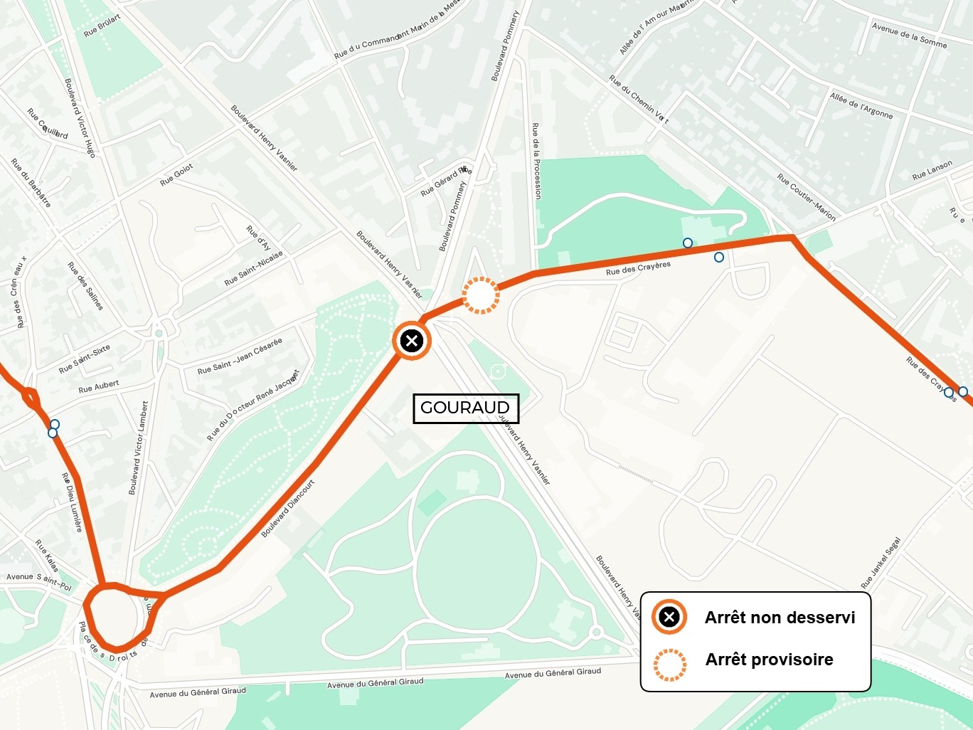 | L'arrêt GOURAUD dans le sens MOULIN DE LA HOUSSE est déplacé rue des Crayères, à l'angle du Bld Pommery (150 mètres après l'arrêt) |