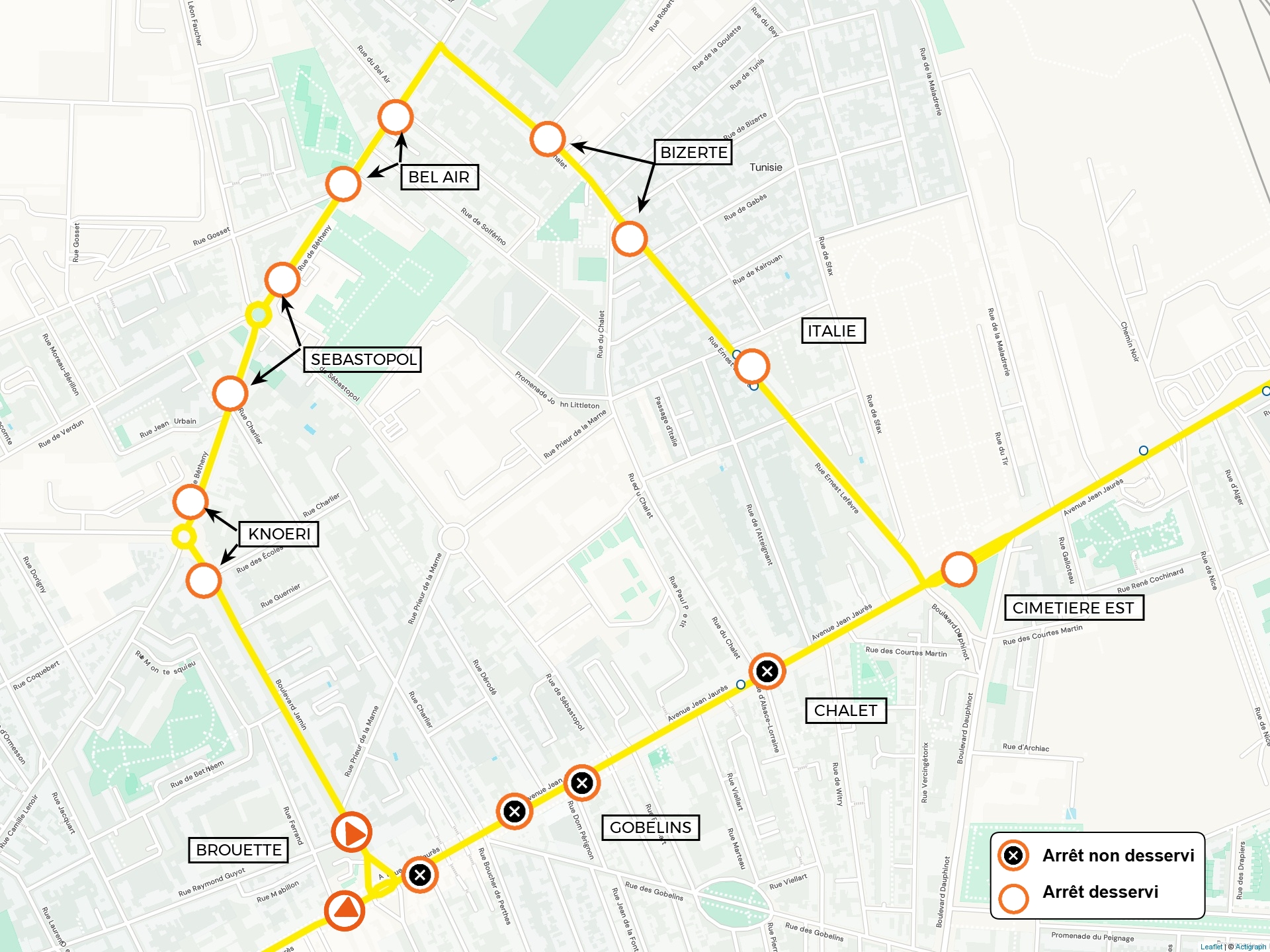 | L'arrêt GOBELINS dans le sens ROUTE DE WITRY est reporté à l'arrêt BROUETTE du dimanche, boulevard Jamin | |