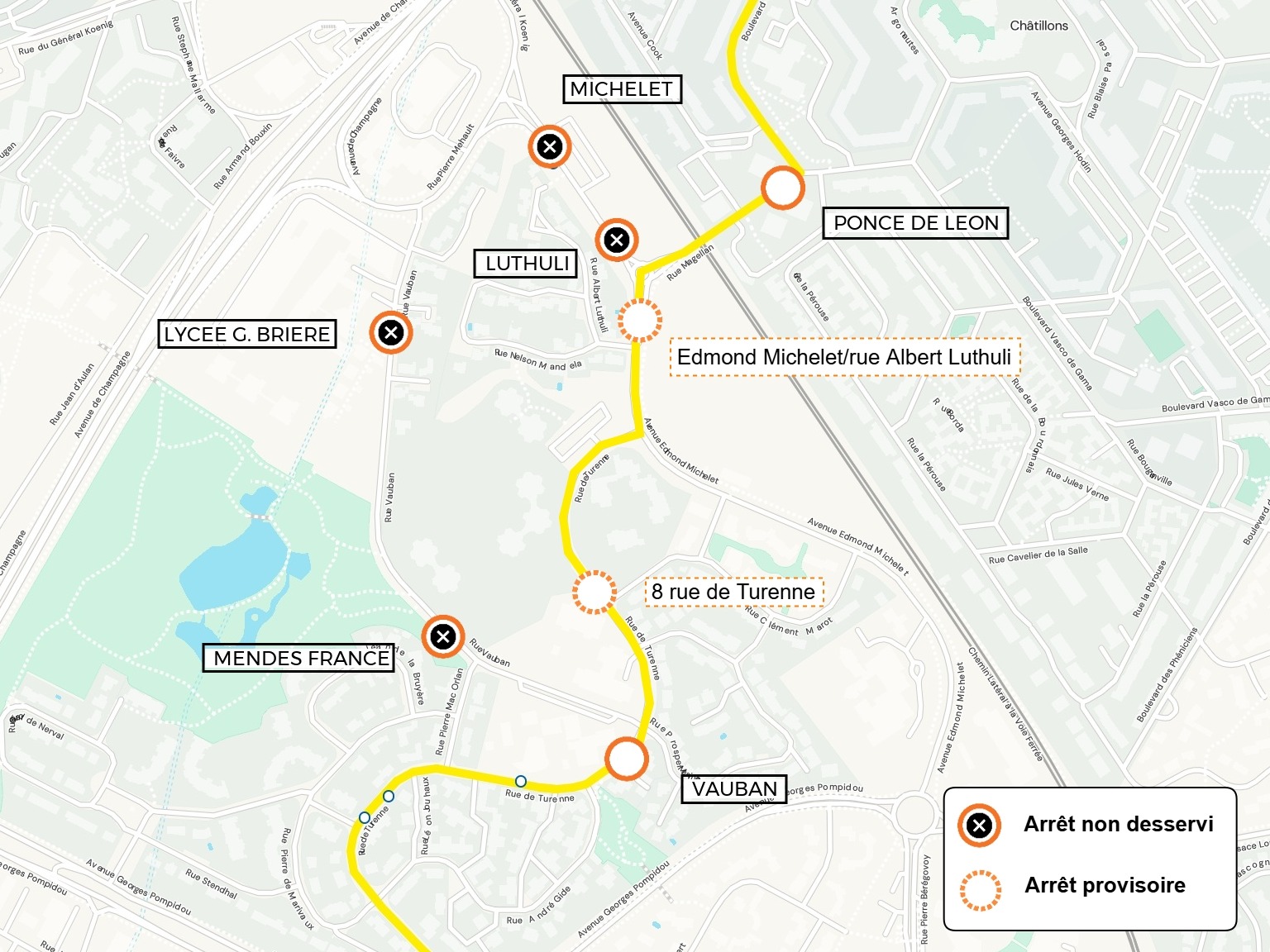 U2 L'arrêt MENDES FRANCE dans le sens C.C. CHAMPFLEURY est reporté à l'arrêt VAUBAN