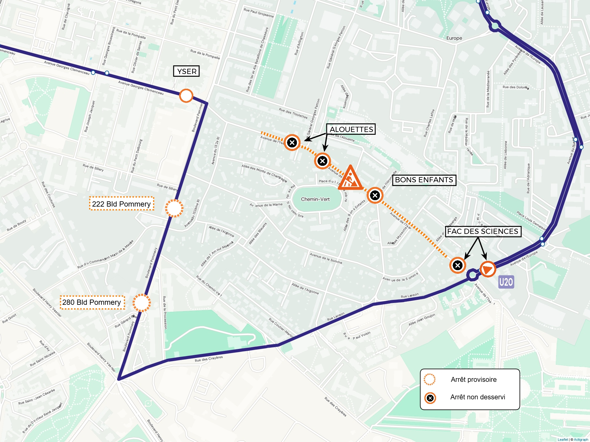 U20 L'arrêt REPUBLIQUE dans le sens FACULTE DES SCIENCES est reporté à l'arrêt SCHNEITER