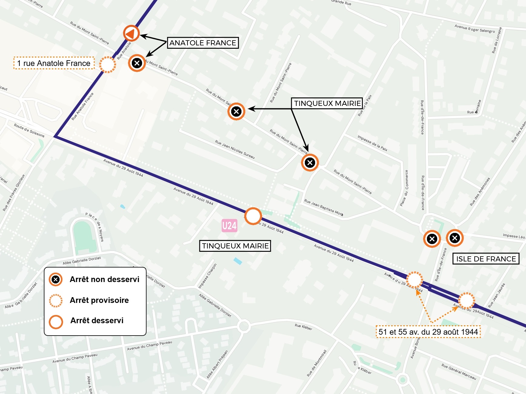 U1 L'arrêt ISLE DE FRANCE dans le sens P+R THILLOIS est déplacé face au n°55 avenue du 29 Août 1944